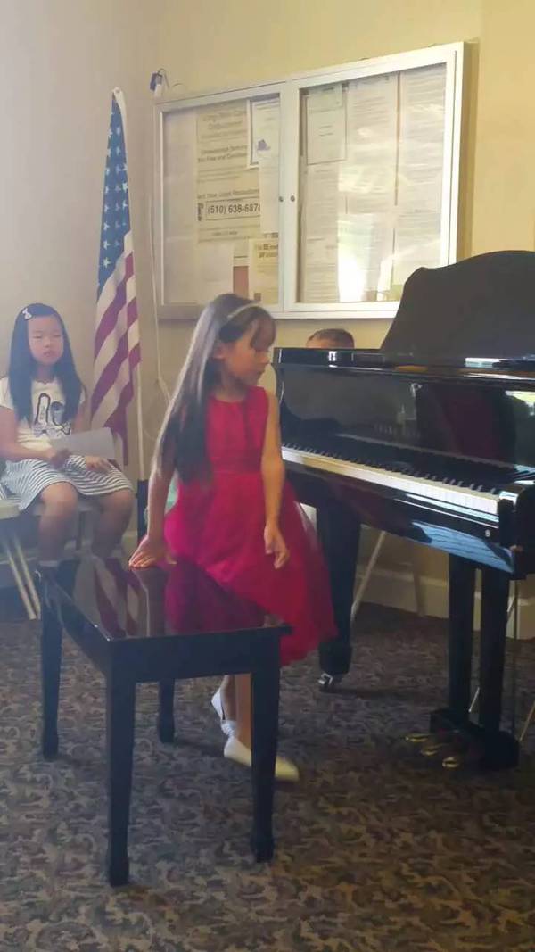 我感觉老师最怕哭的学生,她说最坏的状况是小朋友弹错后哭场就上去抱下来。😓美的怯场类型我还没摸透一一用她自己的说法是她会shy(害羞):有时她好像一点也不怯,比如她四岁时我们在夏威夷玩,数百人众目睽睽的灯光大舞台,她被选中上台与演员共舞,头都不回就上去了还学得跳得一板一眼的。有时她好像很怯,好比这周五晚上在朋友家玩,四个妈妈们问小朋友们表演个唱歌,她磨了半天不愿唱,最后唱得蚊子声。弹琴她究竟会怎么个怯法我之前也没谱。