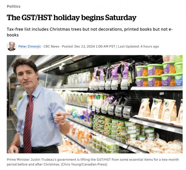 从2024/12/15/开始,联邦政府为期两个月的商品及服务税(GST)/统一销售税(HST)免税期正式开始,旨在为加拿大人降低部分生活必需品的成本。