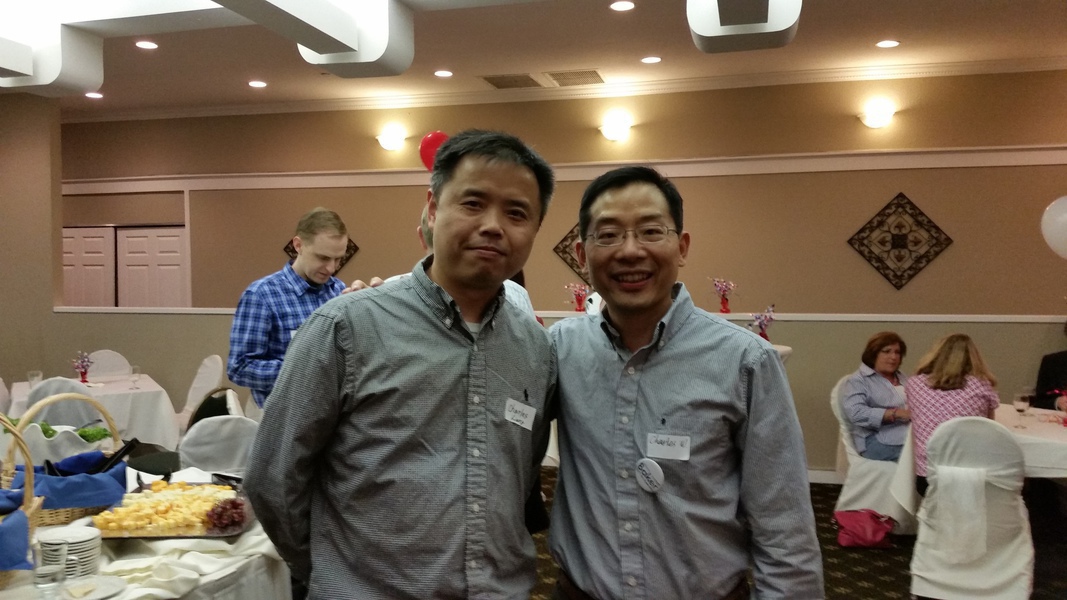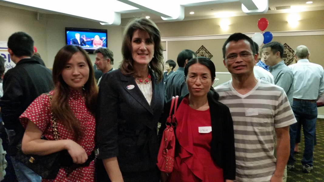 投票结果比预想的还要好,8点开票, 9点时,Baker就以35.8%得票率(13278票)大幅领先于Sbranti 27.6%, Glazer 24.1%.选情大好, 晚会的气氛也变得十分轻松. 大家一群一群地聚在一起, 端着饮料,尝着小点, 讨论着选情和一些其他的话题. 有些义工都合作了几个月, 却第一次见面, 感觉分外亲切. 热情握手, 互相拥抱. AD16区的两位大诗人雷山子和文毫也颇受大家欢迎, 被拉着合影.