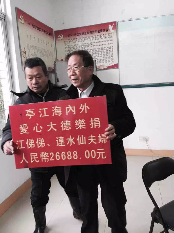 感恩各界愛心大德的慈悲,捐贈亭江2月24日在火災中最需要幫助的兩戶鄉親,江俤俤與連水仙夫婦,及江財妹與江保水夫婦。一方有難,八方支援,體現了鄉里鄉親骨肉情愛。贈人玫瑰,手有餘香,好人一生平安!再次衷心的感謝!