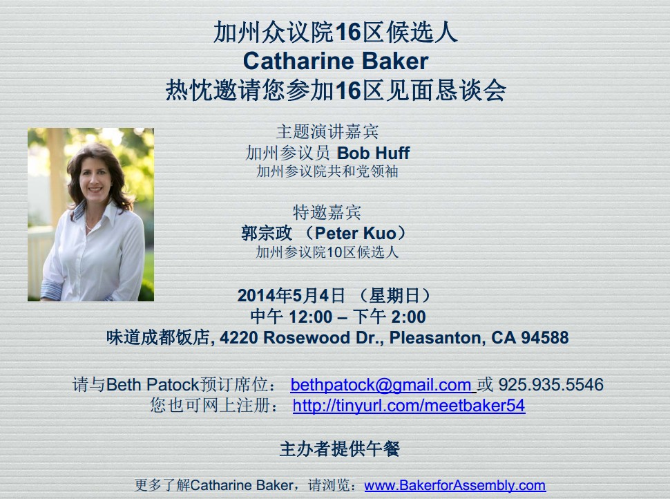 加州众议院16区候选人Catharine Baker热忱邀请您参加16区见面午餐会