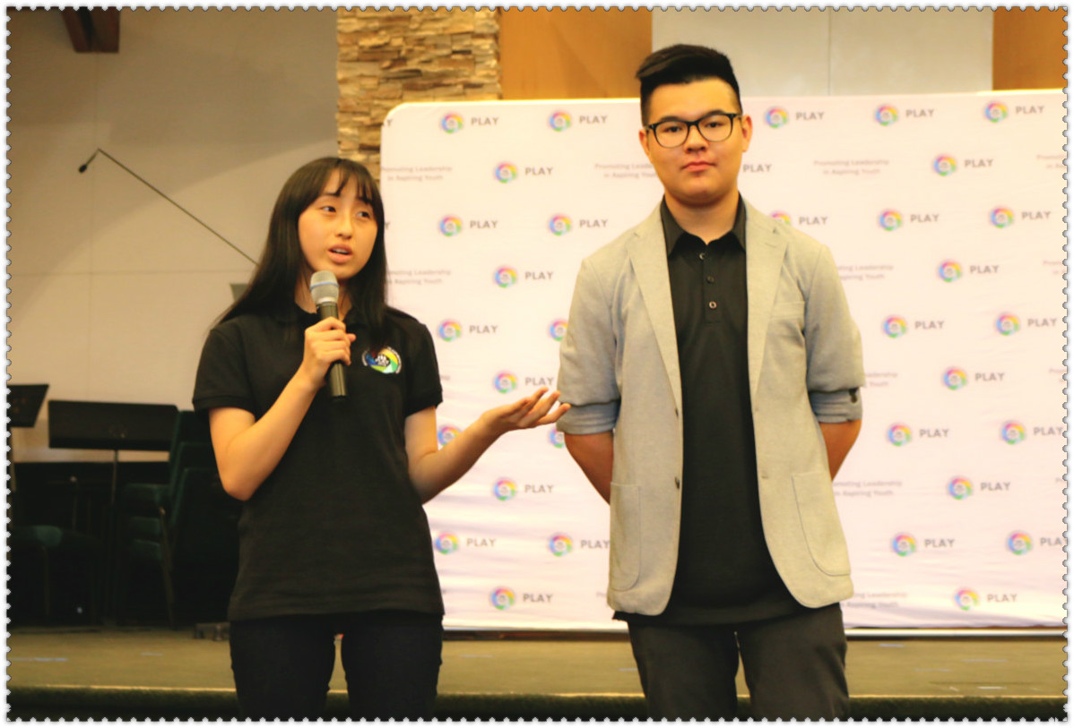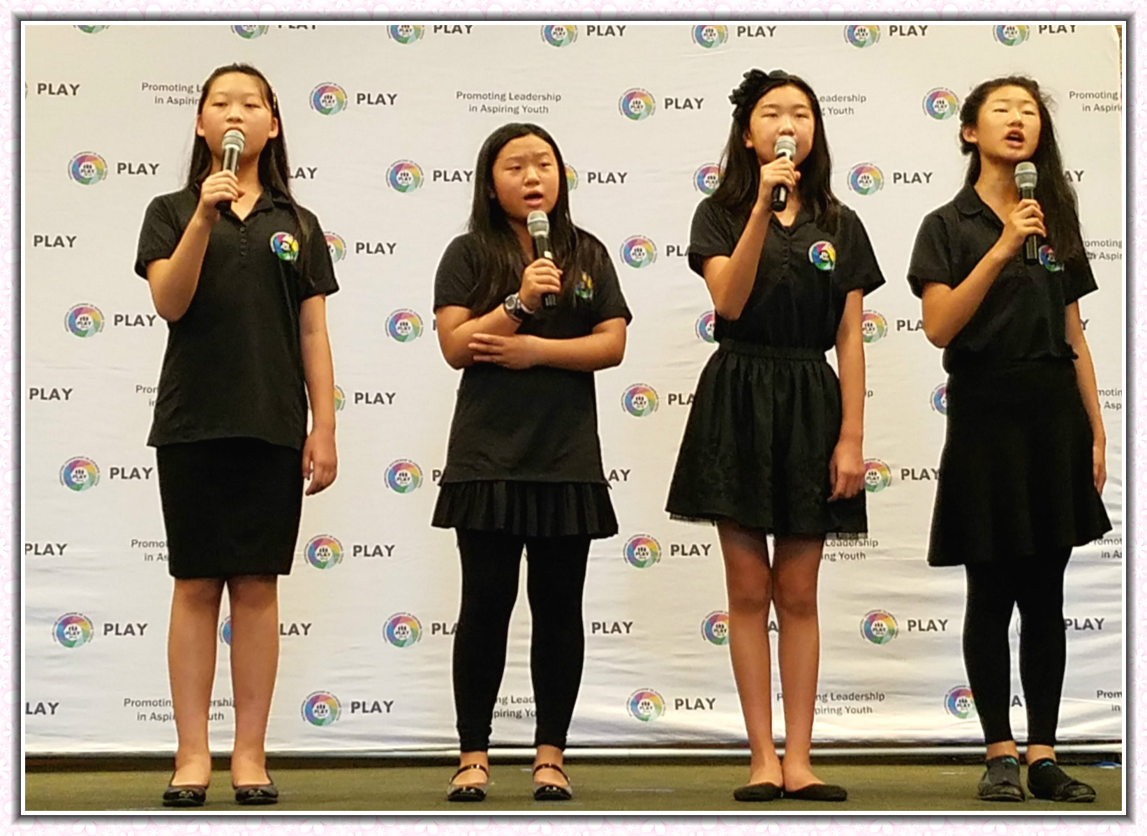 Band演出刚刚落下帷幕,PLAY本届的两位Presidents Andi Mo 及William Fang潇洒大方地走向舞台中央。他们简明扼要地讲述了PLAY 的成立宗旨及发展经过。经过2年多的发展,PLAY在三谷地区早已是一个家喻户晓的领导才能培养俱乐部。很多父母都慕名把孩子送到PLAY。而我们也亲见了孩子们从青涩到成熟的蜕变及激流勇进的成长过程。上图为Andi Mo, William Fang 及本届PLAY Officers 的集体合影。