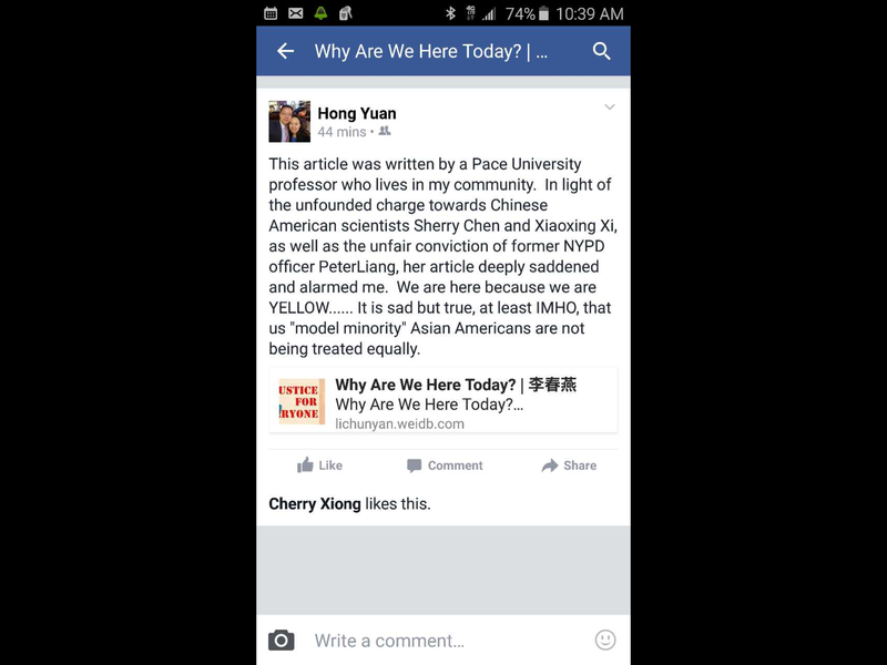 We are here because we are yellow. Just when we thought the Chinese Exclusions Act was long behind us, we had the government baselessly accuse Chinese American scientists such as Sherry Chen and Xiaoxing Xi as spies. We saw the Japanese interment looming when these innocent scientists were persecuted simply because they are yellow.