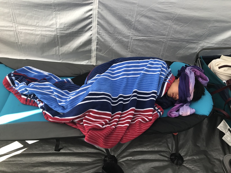 一到比赛,我们家总是带去帐篷支上,四周帘子一拉,冬天不会冷死,夏天不怕晒死,刮风不会吹死。游泳最怕刮风,北加的夏天热不到哪里去,池子里出来风一刮,透心凉。帐篷里除了沙滩折叠椅,还有一个行军床,叫行军床显得简陋了哈,其实很宽敞舒适呢,读到后面你就知道对儿子有多大救命功效了。