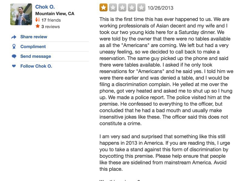I am very sad and surprised that something like this still happens in 2013 in America. If you are reading this, I urge you to take a stand against this form of discrimination by boycotting this premise. Please help ensure that people like these are sidelined from mainstream America. Avoid this place." (整理者苹翻译:文章大意是一对亚裔背景的专业人士夫妇带着两个年幼的孩子去一个饭店吃晚饭,老板告诉他们因为这里是美国,很多美国人要来吃饭所以饭店没有位置了。夫妇在离开后又打电话回去订位子,同样的老板拿起电话告诉他们有位子,夫妇问是否只给“美国人”留着位子他说是的。先生告诉他他们早先去过那里而被拒绝提供一张桌子,他要投诉这种歧视行为。老板对先生猛吼,这位丈夫就挂断了电话。后来警方来了,老板承认所指称的一切,但说自己说话容易漏嘴也爱开这类麻木玩笑。警方说这不是犯罪行为。)
