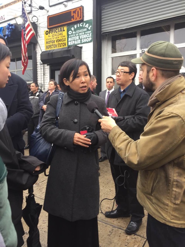 我知道的部分参加者中,南部迎潮廖冰组织搭车,还有各处从早六点就开车到bus站的新老朋友。Millburn和Livingston总共去了16人,我们镇开车往返bus站的Charles也是抗议和助选的大将。刚知道长岛华人协会会长张国栋刚抗议JK时也在现场。迎潮在ABC总部演讲过,廖冰女士更是社区活跃人士。很多无法参加的朋友连夜把捐款送到迎潮家。Helen一直在各群发消息。更有十多年未见的朋友特意给我带了零食的。其他活跃在各处的施景渭、王宏、唐坚、国梁、胜北、向明、May、Sha、海俊、李岳、友军、雁彬、潘岱、谢畅、Jenny、Jenny、金凤、贺南君(从宾州敢来)、游医生一家等等,挂一漏万。难能可贵的是Jing女士(见下面感言),游医生,海俊,廖冰等把孩子也带来参加。廖女士上大学的女儿在车里用流利的中文跟大家分享她的感受(见图),Jing的女儿和母亲站在寒风中情形一直印在我脑海中。