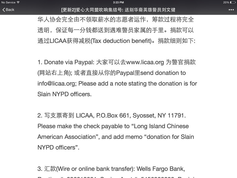 捐款可以通过长岛华人协会Paypal,下午有幸跟长岛协会会长张国栋先生交谈,他们过几天将款项递交家人。网页右上角,写明donation for the Liu family (捐款人可以进一步指定捐款市为哪一位警官,或者指定警官的父母或妻子、儿女)。非常敬佩长岛第一时间组织各种事宜,会长等主力也是日夜协调,写文章,组织bus,花圈等等。