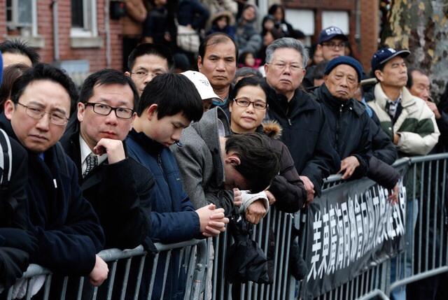 1/6更新,转自长岛华人协会会长张国栋:“昨晚上,新泽西组织华人参加葬礼的负责人向我们表示感谢:说新州华人受到你们的感染,才组织参加的. 其实我知道这是客气话, 新泽西的华人在很多方面都走在我们的前面,是我们学习的榜样,就算没有我们,他们也会去的。13年号召大家在曼哈顿抗议ABC JK 事件就是他们发起的。其实很多事情就怕每个人都想:这事可以让别人去做,或者我等别人做,我再响应。那样的话,就没人做,什么都不会发生。如果没有人站出来号召去参加葬礼,并在读者甚多的微信公共账号推广,大家不会看到,也不会集体乘巴士去参加葬礼。那么就没有中、英文媒体报道华人社团,社区,有组织,成建制地去参加葬礼。我们坚信事在人为!有时候,有些事我们必须挺身而出,挑起我们肩上的责任,责无旁贷。一个社区的变糟,通常不是因为坏人的嚣张,而是因为好人的沉默!我们不能沉默!五人图中左二是李春燕博士,中间是巴尔的摩华人协会的刘会长,右二是宾州的南君,右一是新泽西的张迎潮。康州来的南开校友会长没被照上。”