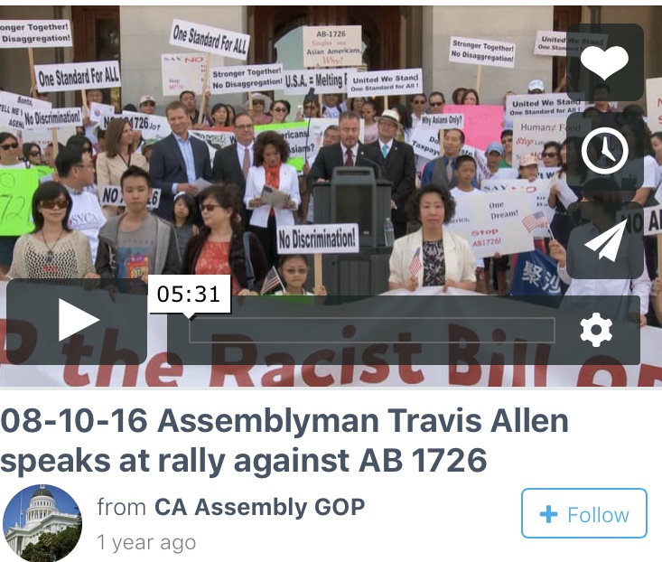 Travis Allen在阻击亚裔细分法集会上的发言录像在这里,感受一下:https://vimeo.com/178377765