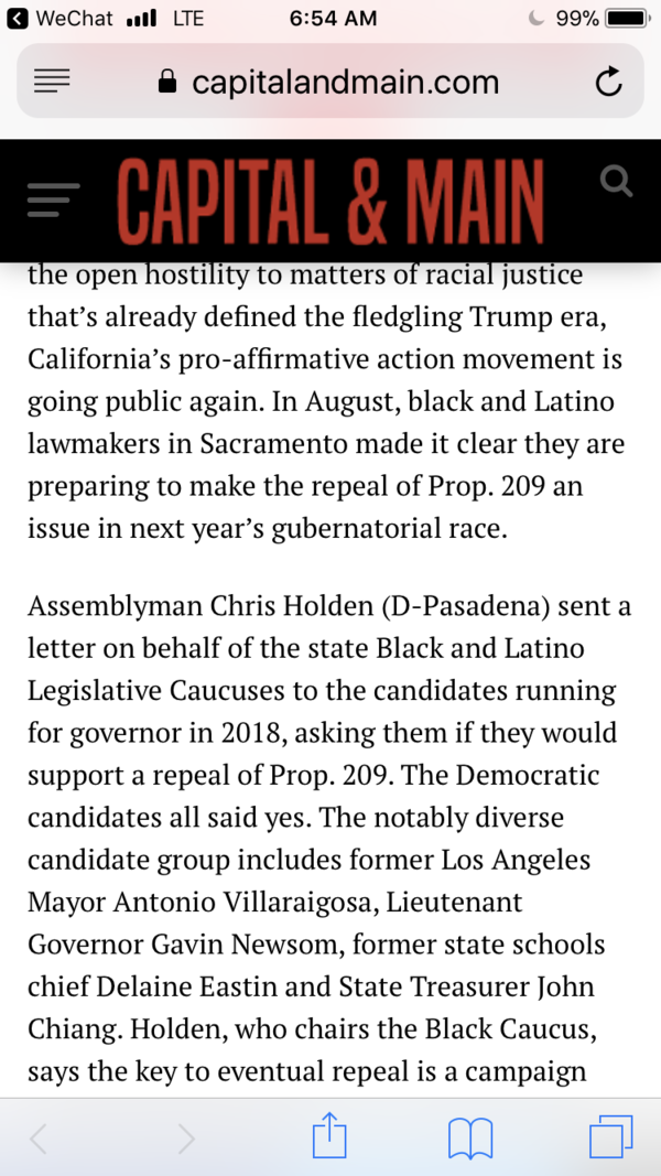 加州黑人和拉丁裔政客掌握了大量加州政坛的资源,他们从来没有放弃推翻Prop209的努力,此次州长竞选,他们专门为此对每一位候选人做了问卷调查,根据2017年十月份发布的调查结果,所有民主党候选人(包括江)都支持推翻Prop209。
