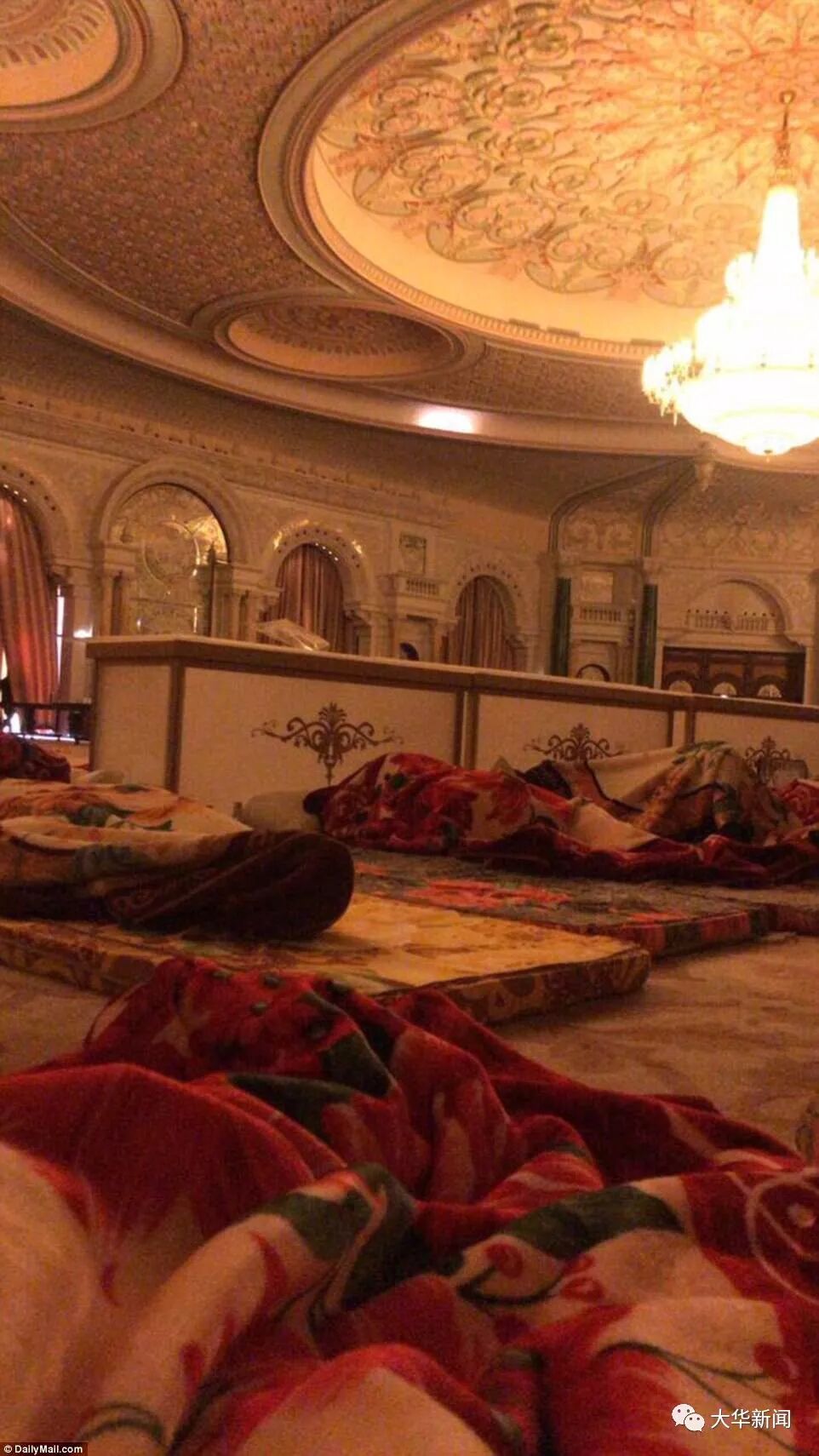 图示:王储萨勒曼的“反腐行动”中,沙特首都利雅得的丽兹•卡尔顿(Ritz Carlton)五星级酒店,成为了关押目前被捕的11位王室成员和38名高级官员的“临时囚牢”。沙特政府内部的线人提供了一张酒店会议大厅的照片。一群人正拥挤的睡在大厅的地板上,除了一张床垫和一条毯子以外,别无他物。这些人就是目前被关押的囚犯。