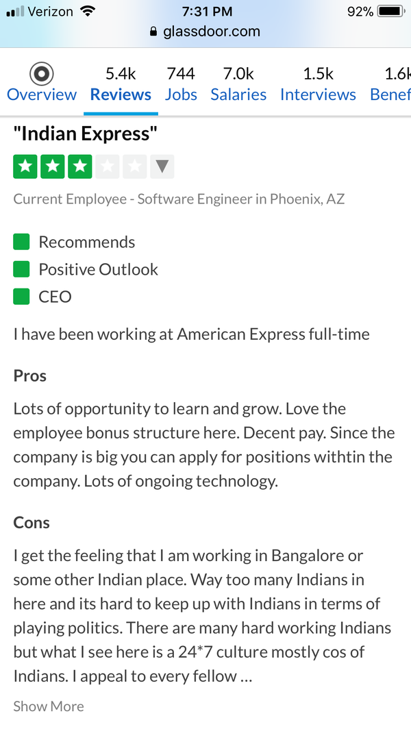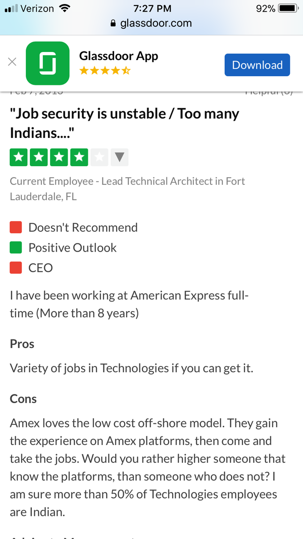 从玻璃门上面对Amex的评论可以看出他们员工对此的评价。有的印度员工说,跑到美国感觉和在印度没啥区别。