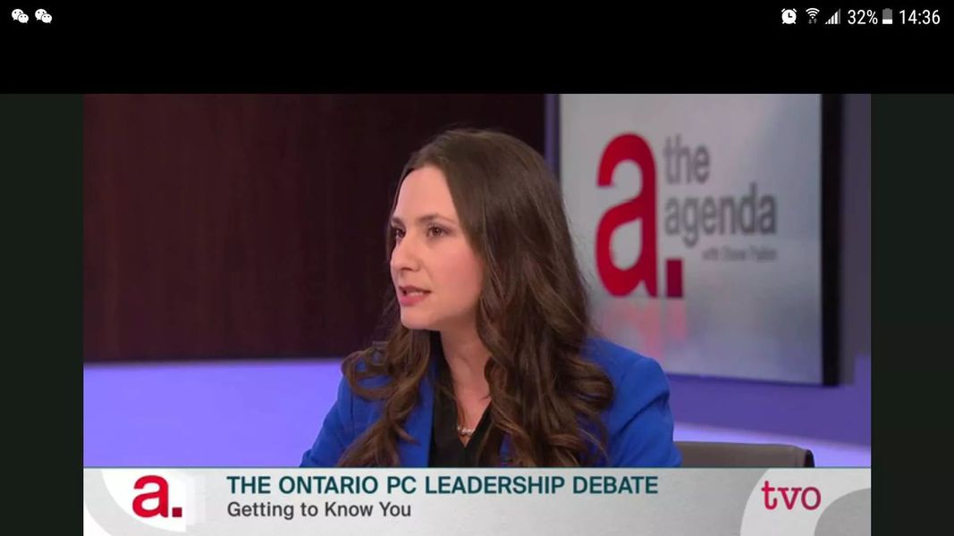 2018年2月15日,唐雅(Tanya)参加了安省保守党党魁候选人电视访谈会。她在长达一小时的电视转播活动中表现得最为出色,他对前领导人帕特里克·布朗(Patrick Brown)进行了严厉的批评,谴责PB在党内进行的“腐败”行为。并表现出对任何话题都毫不畏惧的勇敢精神。她声称“我来这里就是代表草根选民发声的,就是要反对凯萨琳·韦恩(Kathleen Wynne)的新性教育大纲、坚决支持保护生命、支持言论自由等社会保守价值观念”。唐雅(Tanya)坚决反对大麻合法化,认为这是对青少年的不负责任和对国家民众的误导。她还把联邦碳税斥为总理贾斯汀·特鲁多(Justin trudeau)酝酿的“浮夸的想法”,她说如果贾斯汀·特鲁多试图强迫我们这样做,我会把他告上法庭,我会一步步地和他进行斗争。如果他继续这样强迫我们采用碳税,我会告诉你们我们要做什么:我们将采取我们目前的天然气税,我们将把它改名为碳税,这将是碳税;唐雅还强调加国多民族的平等,反对任何特殊族裔特殊群体的特殊待遇等等。