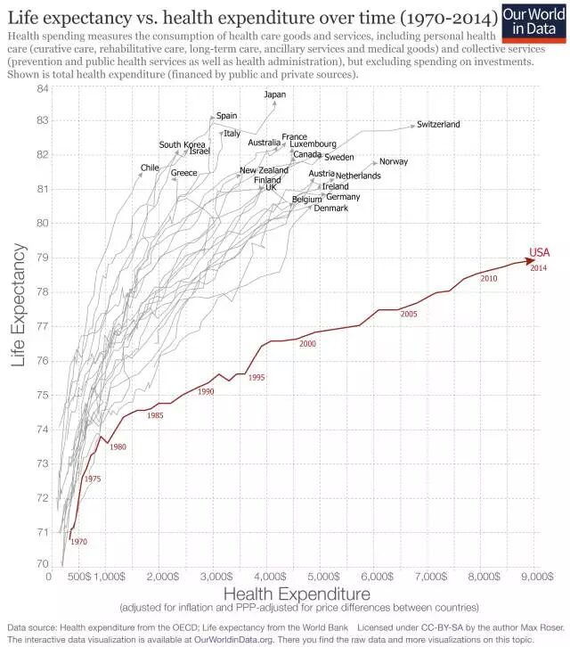 1970-2014年,Y轴是全球预期寿命,X轴是每年健康开支