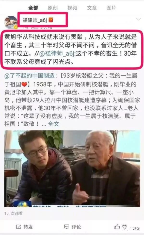 然而,这位称得上民族英雄的老人,春晚当天竟然遭到一个“人渣”在微博上的公开侮辱,而这个“人渣”曾经还是一名律师,现在依然是公务员。他的这种恶劣言行恐怕在世界其他国家都罕见,甚至在西方。
