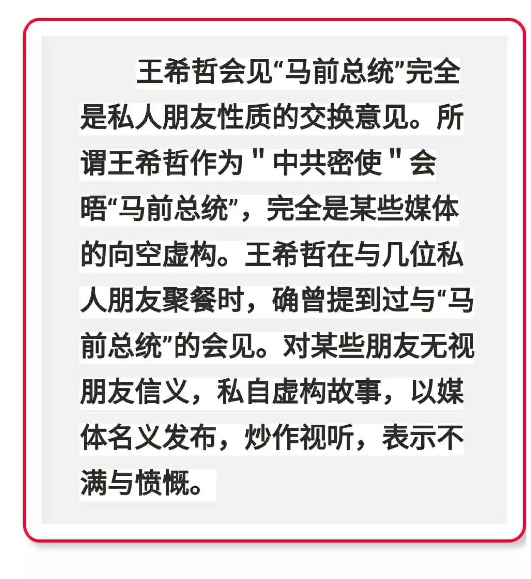 据台湾《中时电子报》3月9日报道,马英九办公室表示,老王是在台大教授黄光国的安排及陪同下,于7日下午拜访的马英九,会面时间仅30分钟,对于两岸关系进行意见交流,过程中完全没提到“传达中共政治局常委W沪宁的信息、密使或自荐密使”等事。 对于马英九与王社长、黄光国等人交流过程,马办强调,办公室有录音为证,会后双方也合影留念。