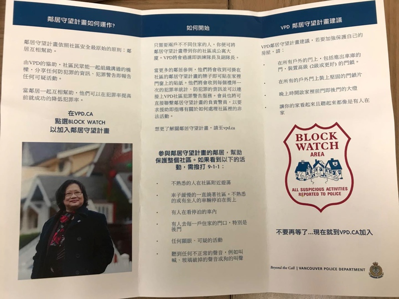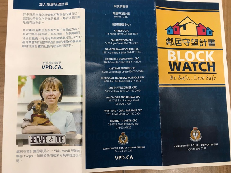 1普及学习习惯使用警力系统。语音不是障碍,911可接通100种语言(更何况我们的普通话和粤语语种在温哥华不算小众)。打911不是在发生犯罪事实后才拨打,我想这是两次会面社区协警Tony学习到的最大观念的改变。一切看到觉得不寻常,有疑问的人或现象都可以随时拨打911,如有人鬼鬼祟祟探头探脑在我们可视范围观察房屋。打911描述此人的特征,做的可疑的事情,走向什么方向,这都是可以报警。不用担心讲得不好,或者判断错误,我们只管打电话,警察或社区协警会来巡逻寻找此人求证在居民区停留的原因。