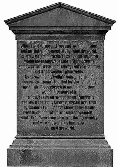 当我躺在床上,行将就木时,我突然意识到: 如果一开始我仅仅去改变我自己,然后作为一个榜样,我可能改变我的家庭;
