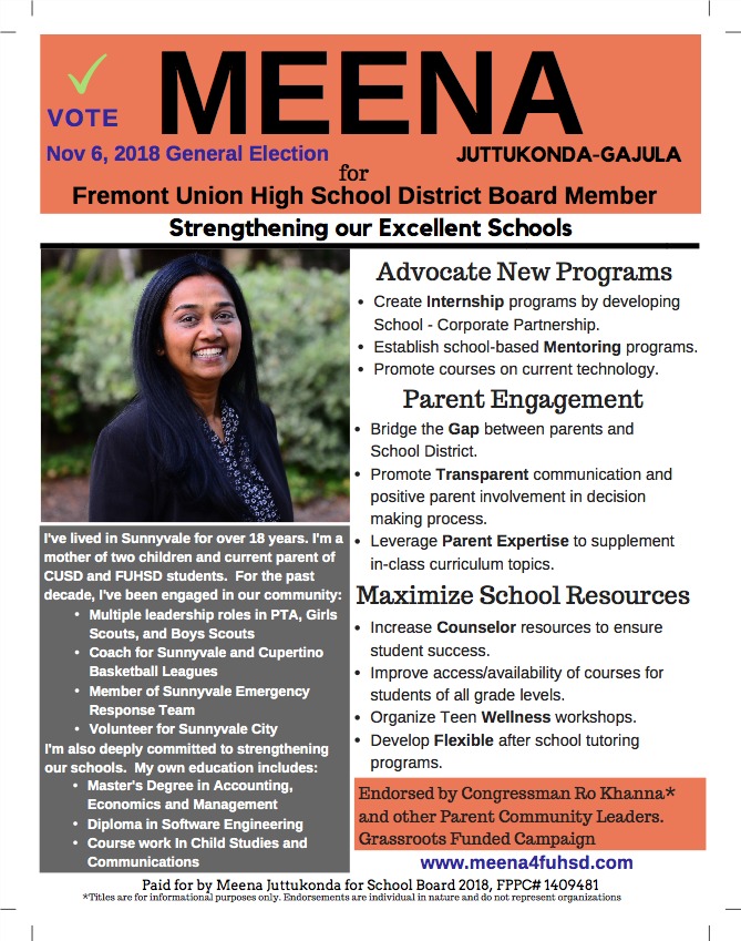 Fremont Union High School District 是涵盖了Sunnyvale, Cupertino, west San Jose 和 部分 Los Altos 的高中学区。学区内五所高中,Fremont High, Homestead High, Monta Vista High, Cupertino High, Lynbrook High,常规选民有六万人。由于选区庞大,多年来,很少会有草根候选人竞选学委这个位置。2016年,一位第一次参选的草根候选人仅以微弱票数落选。今年,又一位草根候选人出来竞选高中学委。她的名字叫 Meena Juttukonda-Gajula. Meena 是一位学区里的妈妈,现在有两个孩子在学区内就读。