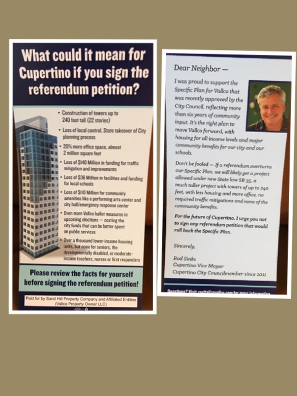 10月4日,很多Cupertino市民都收到了以市议员Rod Sinks的名义发出的一份传单, 呼吁市民千万不要给Better Cupertino发起的Referendum签名,不要反对市议会最近投票通过的Vallco Tier 2超高密项目。而传单的落款,就是Vallco开发商Sand Hill公司。