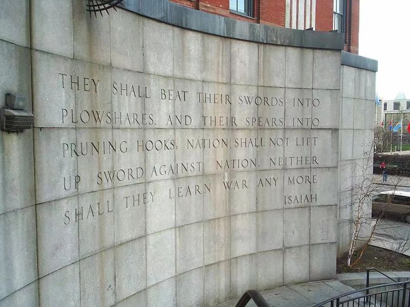 在纽约联合国总部的对面有一个“以赛亚墙”,上面写着一段圣经的经文,