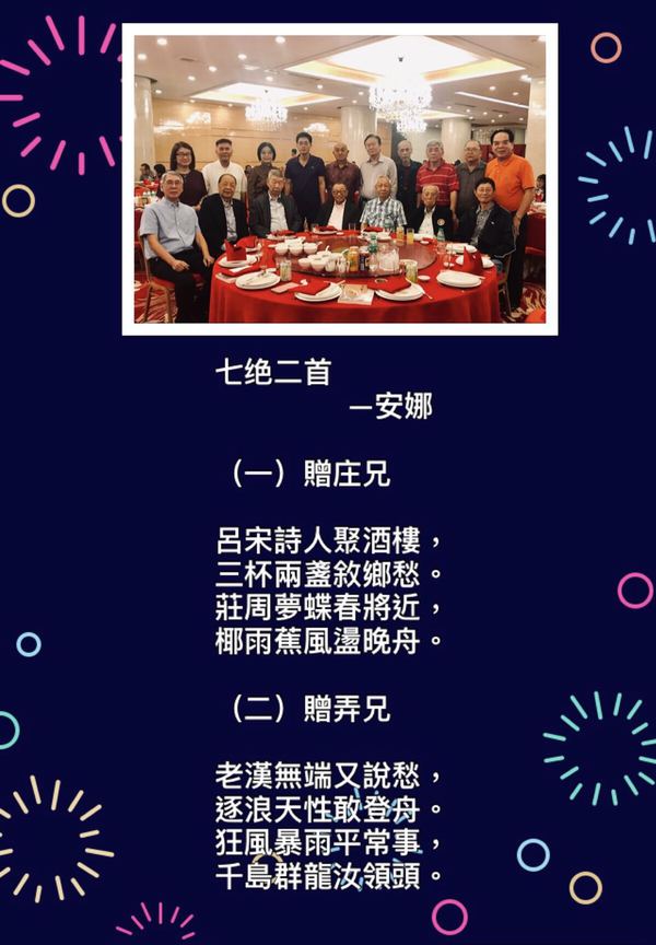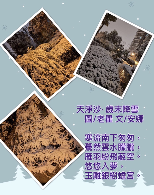 微信發文利器WeiDBcom,點這裡開始!👉👉天淨沙·歲末雪 / 七絕二首·贈詩友 🌟摄影天地 🌟吟詩作對 🌟随笔感悟 Anna-101370 12/30 29706 4.0/1 天淨沙· 歲末降雪 圖/老瞿 文/安娜寒流南下匆匆,驀然雲水朦朧,雁羽紛飛蔽空。悠悠入夢,玉雕銀樹蟾宮。七絕二首·贈吟社詩友(一)贈庄兄呂宋詩人聚酒樓,三杯兩盞敘鄉愁。莊周夢蝶春將近,椰雨蕉風盪晚舟。(二)贈弄兄老漢無端又說愁,逐浪天性敢登舟。狂風暴雨平常事,千島群龍汝領頭。 微信發文利器WeiDBcom,點這裡開始!👉👉 http://www.weidb.co/p123012 获取作者更多文章 上一页 下一页 1. 《芳菲岁月》- 二月冰梦 | 武昌起疫(99293) 2. 遊蘆之湖(41838) 3. 登五合目親近富士山(42240) 4. 自駕遊之富士山河口湖(43060) 5. 虞美人·歲暮抒懷(63474) 6. 七律/七絕/虞美人(迴文)(41968) 7. 秋夜雨/減字木蘭花(35537) 8. 踏莎行·詠殘荷(38656) 9. 劉姥姥進大學城下集(35426) 10. 喝火令·遊中大(34174) 11. 「青山不老白頭新」軲轆體(21901) 12. 五律咏夏至(40740) 13. 南瀛六月社課(18853) 14. 七律·和順古鎮(36519) 15. 鷓鴣天·詠攝友(35003) 16. 七律二首(34993) 17. 元曲 春光好/一半兒(21188) 18. 漁歌子·紫藤(25255) 19. 眼兒媚·詠櫻(22901) 20. 清江引二首/五律·杜鵑(33776) 21. 攤破浣溪沙· 神的傑作(28337) 22. 七律·題培炎圖(23714) 23. 五律·詠海鷗(33634) 24. 南瀛吟社二月社課(23862) 25. 七絕·梅花三弄(21801) 26. 己亥有感 / 浣溪沙·少年舞者(25174) 27. 定風波·紅梅 / 七律·臘梅(44388) 28. 天淨沙·歲末雪 / 七絕二首·贈詩友(29706) 29. 天淨沙·詠楓 / 南歌子·伯勞鳥(30988) 30. 清平樂·雪/七律·晨運偶題(27410) 31. 七律二首(32503) 32. 如夢令·人民的選擇(27559) 33. 五律二首/釆桑子(31807) 34. 耳機四重奏/一剪梅(30315) 35. 七律·詠攝友(30767) 36. 喝火令·逛海濱(29059) 37. 七律二首 (22451) 38. 五律二首(23429) 39. 詞二闕(32951) 40. 斯普利特(Split)(28732) 41. 斯洛文尼亞 (28569) 42. 克羅地亞(29470) 43. 七絕二首(36761) 44. 莫道桑榆晚 為霞尚滿天(34344) 45. 塞爾維亞(28433) 46. 波斯尼亞(28633) 47. 巴杜華高塔爾(29193) 48. 杜邦力古城(29595) 49. 七律·吟攝友(26978) 50. 【海石诗】月三首 (兼谈中秋月)(55253) 上一页 下一页