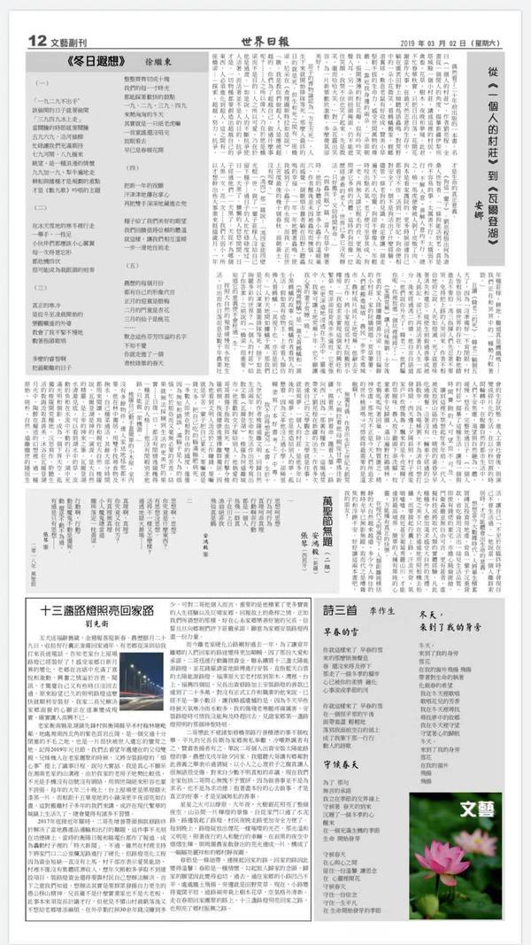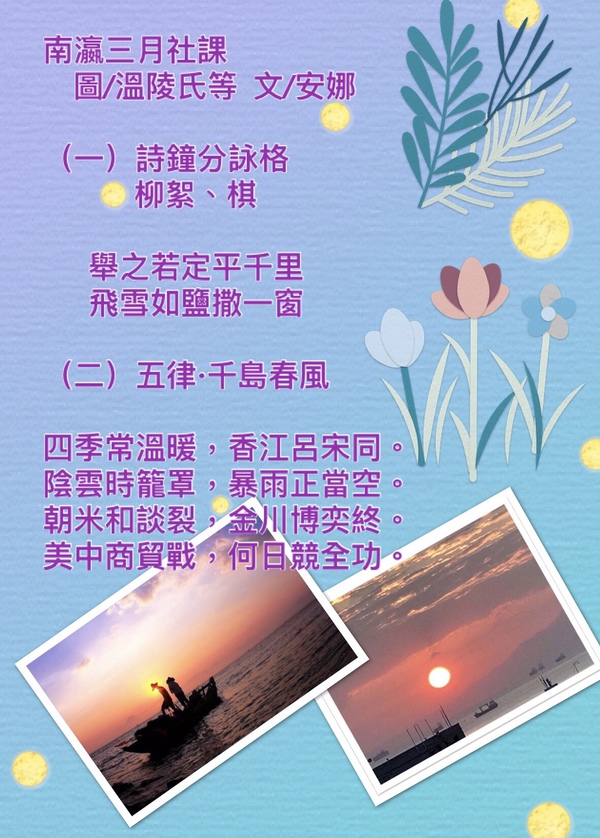 微信發文利器WeiDBcom,點這裡開始!👉👉南瀛三月社課 🌟吟詩作對 🌟人生点滴 🌟指点江山 Anna-101370 03/01 28050 4.0/2 圖/來自小傳:高洪懋老師畫作及紀念上山下鄉50週年文/安娜南瀛三月社課(指定題目)(一)詩鐘分詠格 柳絮、棋 舉之若定平千里 飛雪如鹽撒一窗(二)五律·千島春風四季常溫暖,香江呂宋同。陰雲時籠罩,暴雨正當空。朝米和談裂,金川博奕終。美中商貿戰,何日競全功。 微信發文利器WeiDBcom,點這裡開始!👉👉 http://www.weidb.co/p123651 获取作者更多文章 上一页 下一页 1. 肥哥天地•冰雪世界(31972) 2. 《芳菲岁月》- 二月冰梦 | 武昌起疫(99297) 3. 虞美人·歲暮抒懷(63479) 4. 詩集《邂逅詩歌》(39999) 5. 七律/七絕/虞美人(迴文)(41974) 6. 秋夜雨/減字木蘭花(35539) 7. 踏莎行·詠殘荷(38659) 8. 喝火令·遊中大(34179) 9. 「青山不老白頭新」軲轆體(21903) 10. 五律咏夏至(40746) 11. 南瀛六月社課(18856) 12. 五律二首(41033) 13. 七律·和順古鎮(36521) 14. 鷓鴣天·詠攝友(35008) 15. 七律二首(34998) 16. 元曲 春光好/一半兒(21192) 17. 漁歌子·紫藤(25256) 18. 眼兒媚·詠櫻(22904) 19. 清江引二首/五律·杜鵑(33779) 20. 攤破浣溪沙· 神的傑作(28339) 21. 七律·題培炎圖(23718) 22. 南瀛三月社課(28050) 23. 五律·詠海鷗(33642) 24. 南瀛吟社二月社課(23863) 25. 七絕·梅花三弄(21804) 26. 己亥有感 / 浣溪沙·少年舞者(25174) 27. 定風波·紅梅 / 七律·臘梅(44396) 28. 天淨沙·歲末雪 / 七絕二首·贈詩友(29709) 29. 天淨沙·詠楓 / 南歌子·伯勞鳥(30992) 30. 肥哥天地•新年感悟(21953) 31. 清平樂·雪/七律·晨運偶題(27411) 32. 肥哥之友•富贵病(58636) 33. 七律二首(32506) 34. 如夢令·人民的選擇(27563) 35. 五律二首/釆桑子(31810) 36. 耳機四重奏/一剪梅(30317) 37. 七律·詠攝友(30769) 38. 喝火令·逛海濱(29061) 39. 七律二首 (22453) 40. 五律二首(23430) 41. 詞二闕(32957) 42. 一個人去流浪(28259) 43. 七絕二首(36766) 44. 莫道桑榆晚 為霞尚滿天(34347) 45. 七律·吟攝友(26983) 46. 幻秋(39645) 47. 一字诗(21380) 48. 江城子 ● 老夫老妻二十年(19528) 49. 【海石诗】月三首 (兼谈中秋月)(55259) 50. 七律·詠雀兒/30首蘇聯老歌串燒(34536) 上一页 下一页