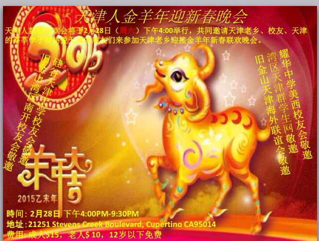 美国旧金山天津海外联谊会、硅谷天大校友会、南开湾区校友会、耀华美西校友会、湾区天津群学生网, 共同邀请天津老乡、校友、天津的莘莘学子和热爱天津的朋友们来参加天津老乡迎接金羊年新春联欢晚会。这将是一个难得的贵友新知相识相聚的好机会。届时更有精彩的节目、摸彩、手工水饺和特色天津美食等着大家。食物由大会统筹按排,希望您和全家轻轻松松享受天津的特色,和纯天然的咖啡,享受美好的音乐,我们期待您的到来。