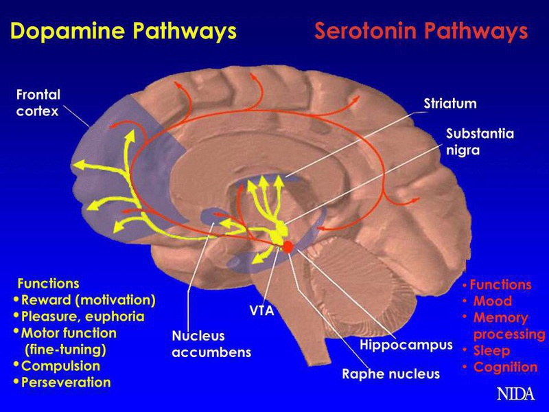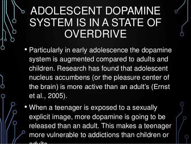 5. 上瘾是一种特别形式的记忆。这种记忆不在大脑的海马区(hippocampus),而是在伏隔核(nucleus accumbens)和腹侧被盖区(ventral tegmental area, VTA)。不良行为和毒品强烈刺激这里的可塑性极强的神经连线,使它们的受体和由多巴胺传导的信号增高,连接加强,并使因每一次刺激而释放的多巴胺量递增,因此青少年对上瘾因子的渴望会比成人更快速地加强,从而也会更根固于他们的记忆。25岁以下的青少年瘾君子比成人更难戒毒。