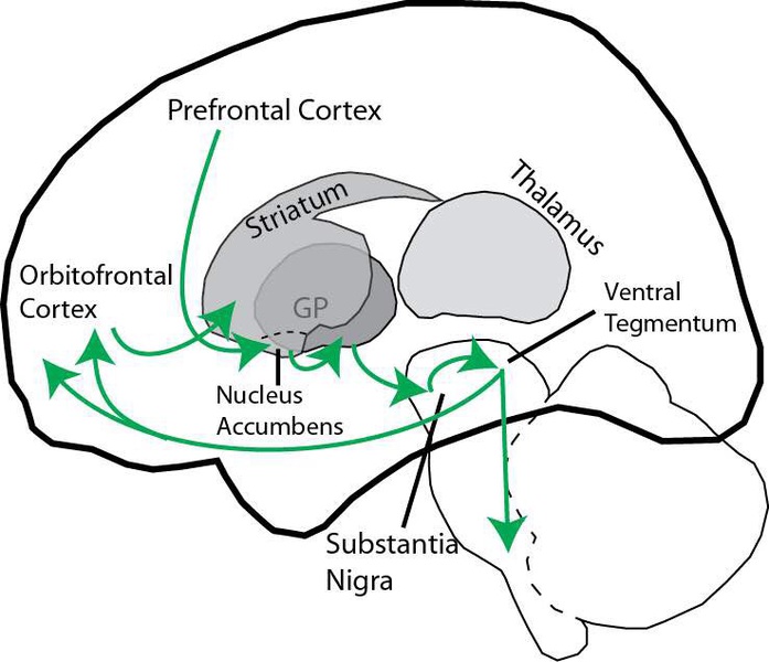 6. 危险感和满足感紧密相连,其机制在大脑中共存于很多同样的神经结构中。伏隔核(nucleus accumbens)和腹侧被盖区(ventral tegmental area, VTA)是满足感的中心,但它们的活动是受额叶控制的。成人成熟的额叶能够有效地控制其冲动行为。