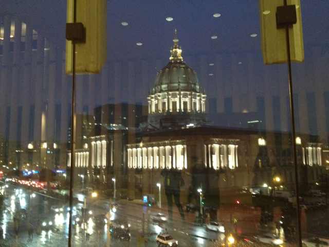 当夜下雨。雨水使巿政大厅变得水光波影,如梦如幻。终于告别干旱,有雨水了。加州今夜昰lucky的,也是happy的。
