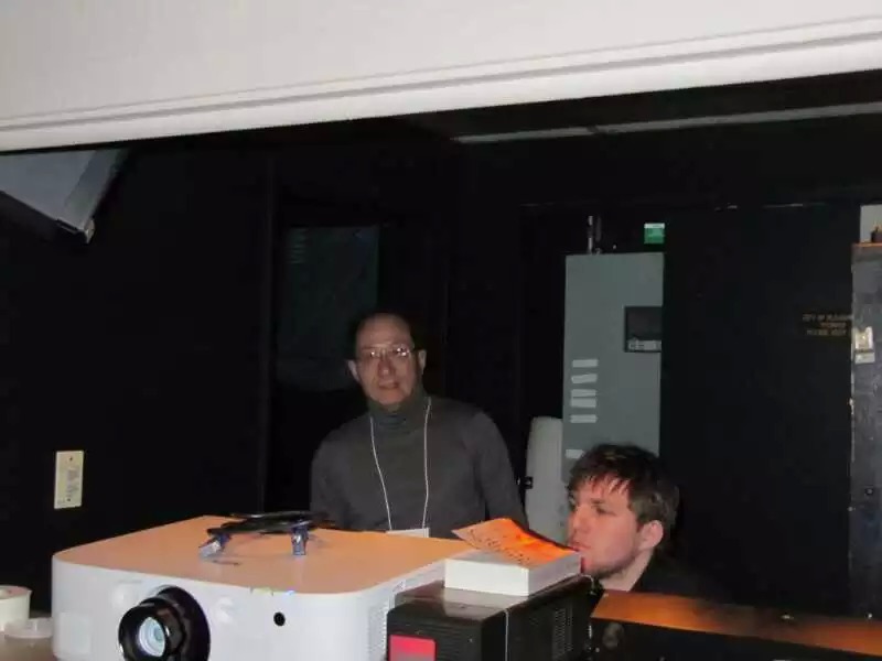 总导演Jun Xue (左) 和舞台总监Han Qu 在认真准备晚会.他们总是考虑得非常周到,安排得井井有条.以保证晚会得以顺利成功举行.