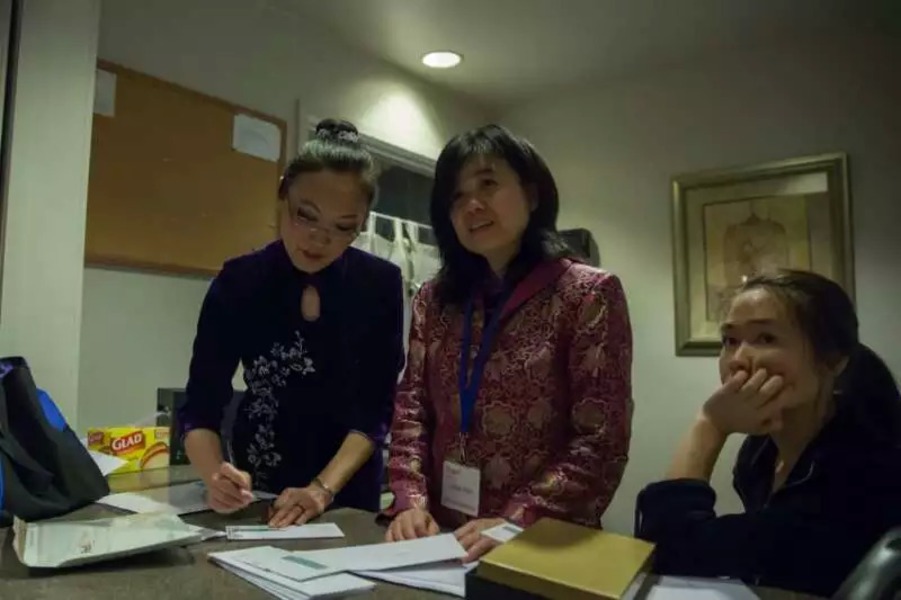 Gracie Chen (中) 带着女儿在门口售票, 还负责给前来取票的观众提供服务。