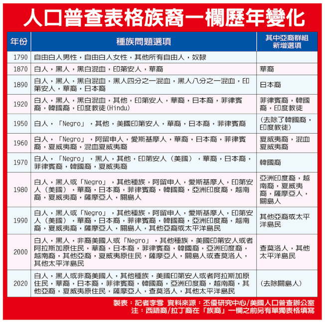 1870年,“华裔”成为第一个亚裔分类,出现在美国人口普查表格上,与白人、黑人、黑白混血和印地安人并列。二十年后的1890年,又出现了第二个日本裔。此后在上世纪期间,不断增加或修改不同类型的亚裔,至今亚太裔的分类已有:华裔、日本裔、菲律宾裔、韩国裔、亚洲印度裔、越南裔、其他亚裔、夏威夷原住民、萨摩亚人、查莫洛人、其他太平洋岛民等选项,并按人口规模排序。这些选项都是与白人、黑人或非裔等其他大类族裔并列。