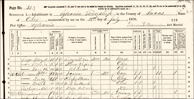 上表:1870年的人口普查表上华裔第一次在族裔一栏出现,如是华裔则在第六号格子填写C(取自Ancestry.com)