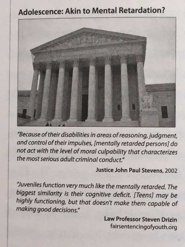 3. 西北大学的Steven Drizin教授指出:“青少年的行为很像是精神不健全的病人。它们最大的相似之处是意识能力的缺失。虽然他们在其它方面的能力极强,但并不能代表他们会具备良好的判决能力。”