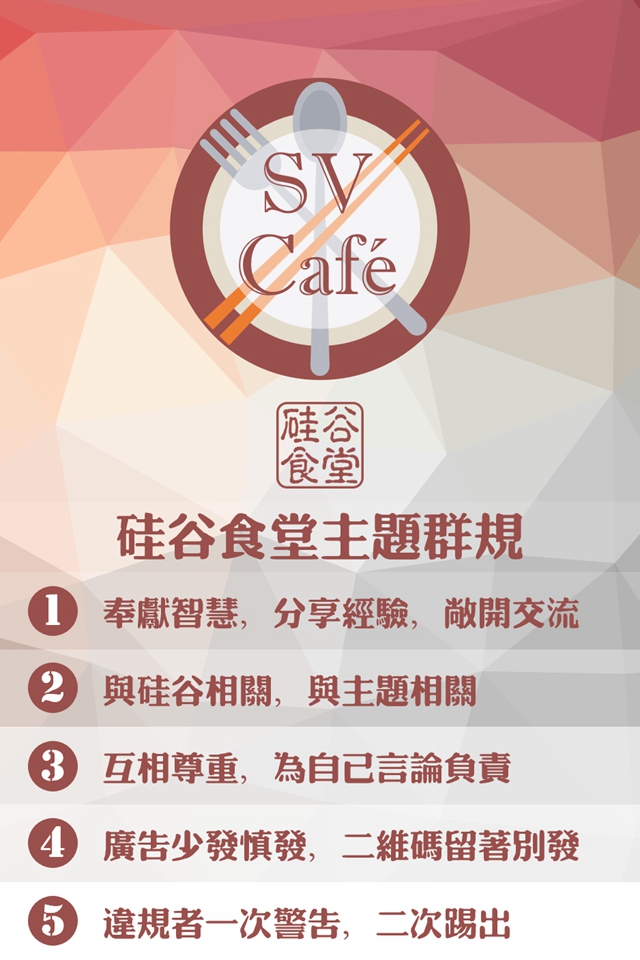 【硅谷食堂主题】群是我们餐会活动的线上延伸,一则让已参会碰撞的朋友就相关主题继续激荡,二则让无法参会的朋友有机会线上分享;一般来说餐会时大家迸发出令人惊喜的能量,当然我们也希望这些正能量扩散到线上群,但目前还没有效的方式线下线上和一,互补功能较可行。硅谷食堂希望大家各尽所能各取所需,也请各位朋友维护主题群的专业水准。有空来食堂吃大锅饭,来了你就知道怎么一回事;因实际情况不能来,也请参加群里讨论分享,一定会得到有价值信息。