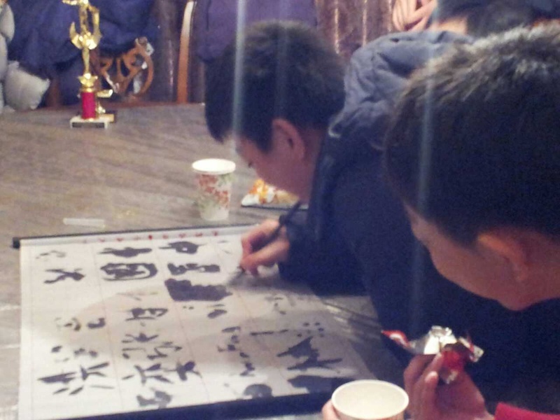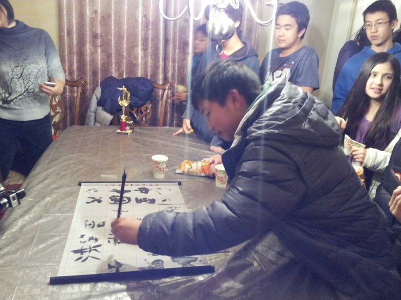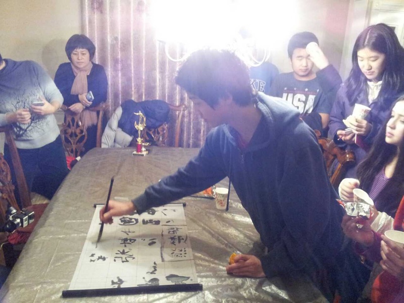 会后中国来的书法家家长还展示了毛笔字,学生们积极模仿(附图),欢声笑语不绝于耳,忘记了周五一天上学晚上又赶来参加活动的劳顿。下面是中国学生领队介绍珠海电视台教育部和ABC俱乐部的合作。