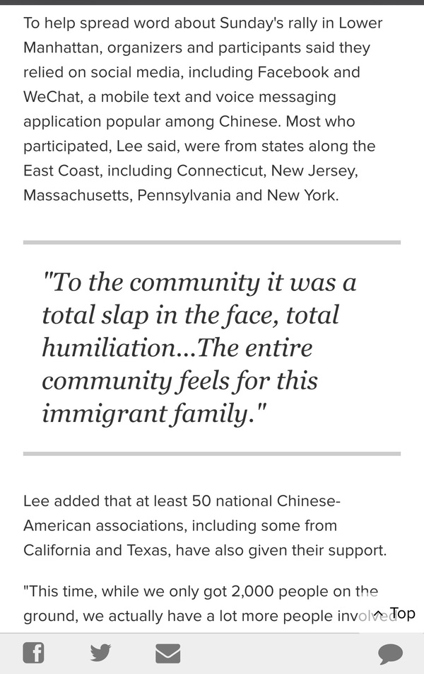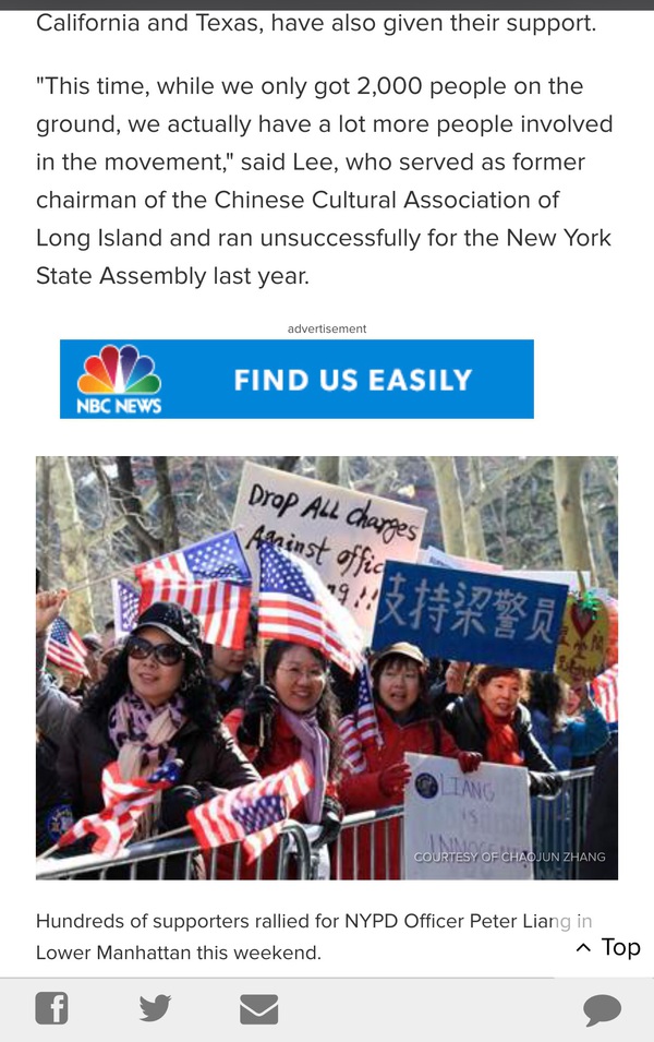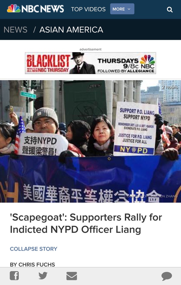 转贴朋友圈里别人发的:“主流媒体真的报道我们华人的游行了!划时代了!” 、“终于有一篇说出我们观点的主流英文媒体报道了”、“以替罪羊的醒目标题,NBC报道了上周日纽约华人空前集会游行,反对因危险执行警务环境走火事故不巧而致命起诉华裔警员二级谋杀罪。” 非常感谢NBC 作为美国乃至全世界最早成立的广播公司,美国的广播network举足轻重的传统三巨头之一,做出了公正(甚至略微偏向我们)的报道。NBC这篇报道是对参加的游行示威活动的每一个人,以及全美其他地区为游行出谋划策、文宣、制作Poster出力的每一个人的辛勤付出的最好的认可和回报。为这群团结无畏的勇士们感到骄傲和自豪!向无数的不知名的幕后英雄们致敬!美国华人的争取合法、平等权益的活动长期被主流社会忽视,主流媒体的报道常常一稿难求,就像一堵墙横在我们的面前。但是这堵墙再厚,只要我们前赴后继不停地撞,总会撞出裂缝、墙总有倒的一天。实在看不惯主流媒体对我们华人游行抗议的一贯故意忽视(LICAA的一些成员参加了2013年的抗议ABC JK事件游行示威也深有同感)。三月八号的支持梁警官游行,其他主流媒体又是选择不报道,而有些小的英文媒体对我们更是恶毒攻击,令人忍无可忍。为了打破这一局面,LICAA通过与NBC的良好互动,非常有幸地为支持梁警官活动贡献了“蝴蝶一煽翅膀”的微薄之力。也希望NBC这篇报道会引起未来更多主流媒体对华人平权活动的公正报道。最后号召全美的华人组织团结起来,放弃一切私利,搁置党派之争,共同为争取华人的权益,做永不言弃的奋斗!