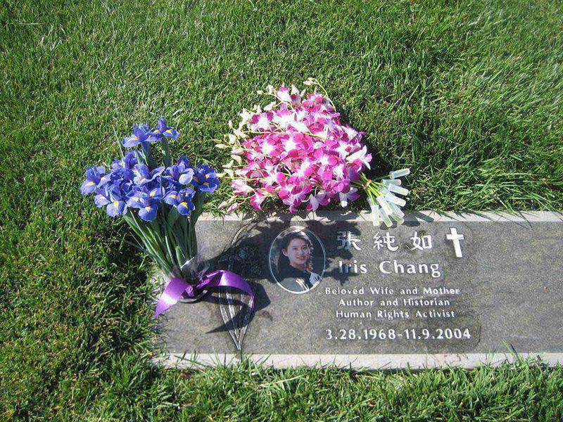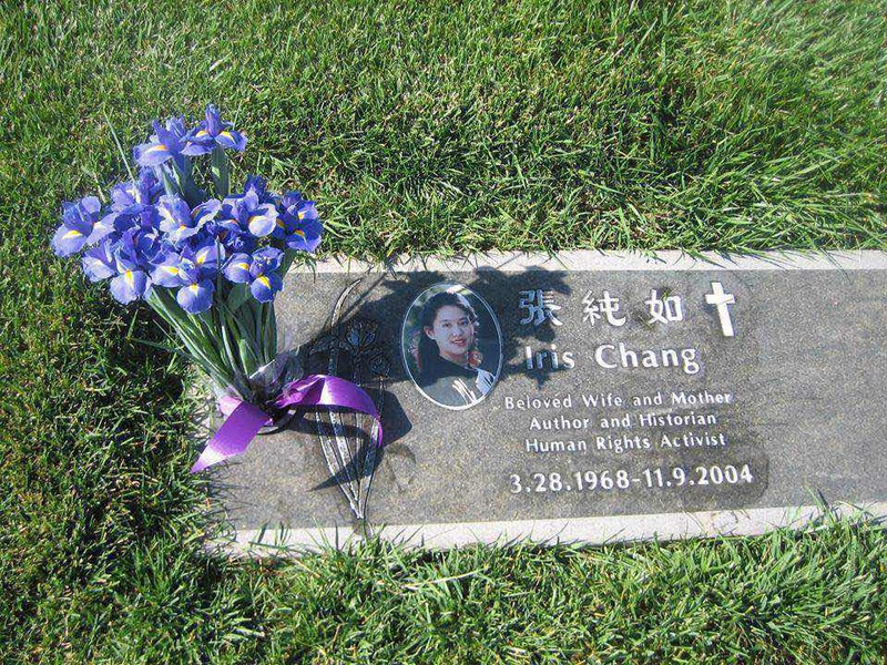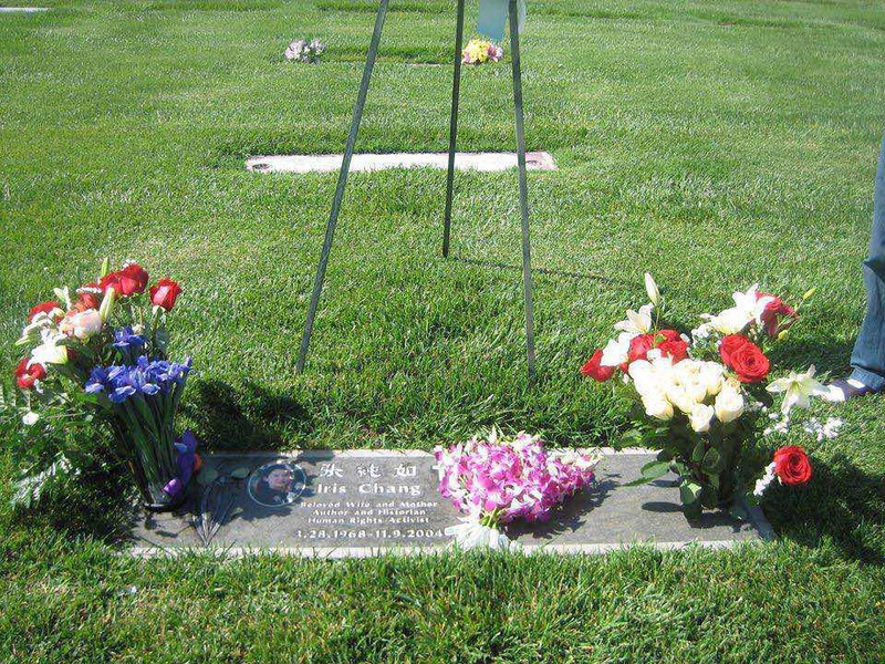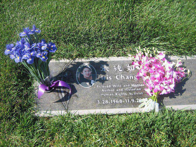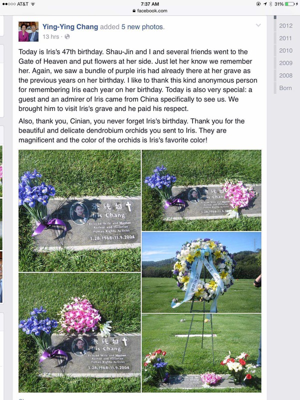 Today is Iris's 47th birthday. Shau-Jin and I and several friends went to the Gate of Heaven and put flowers at her side. Just let her know we remember her. Again, we saw a bundle of purple iris had already there at her grave as the previous years on her birthday. I like to thank this kind anonymous person for remembering Iris each year on her birthday. Today is also very special: a guest and an admirer of Iris came from China specifically to see us. We brought him to visit Iris's grave and he paid his respect.