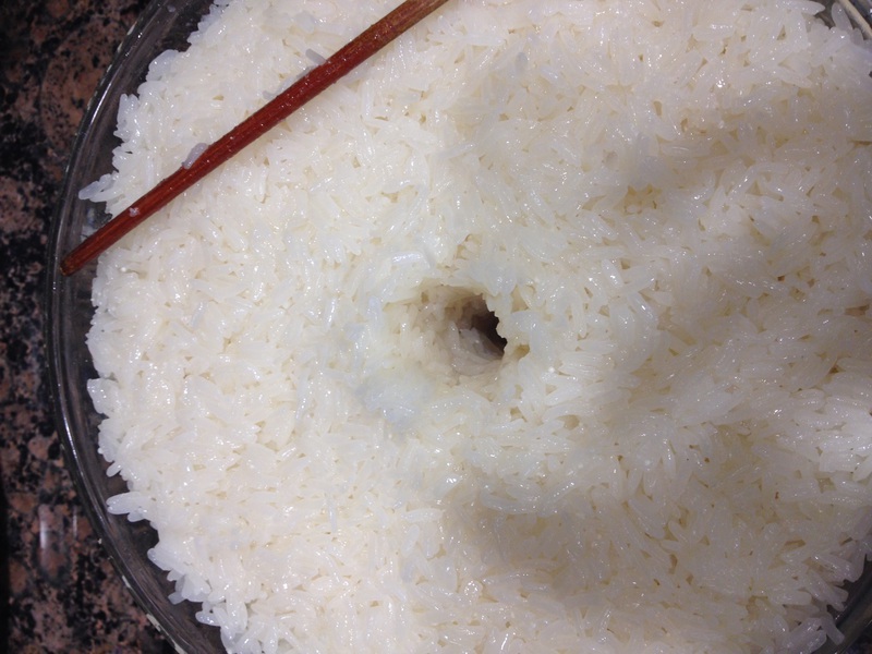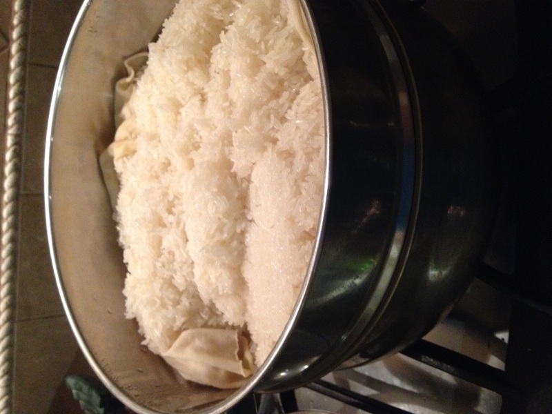 然后就是怎么弄熟?过去我的方法是,用电饭锅做米饭的方法,少加一点水,煮熟糯米。可是用煮的方法,糯米的颗粒感保持不是很好,哪怕是做的很干也不行。后来我改成用蒸锅蒸,效果好多了。不过,在蒸之前,先要把糯米泡一个晚上,至少十个钟头吧,糯米吸足了水,才容易蒸透。在蒸锅里面铺上屉布,铺开糯米,蒸一个钟头就好。如果糯米量太大,比如我一次做七碗糯米,那么蒸的中间还需要翻一次米,这样才能保证蒸透蒸均匀。
