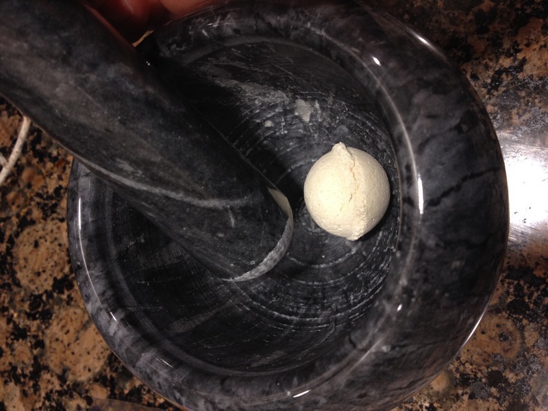 等着糯米彻底凉到室温的时候,可以处理酒药球。我买的是大华上海酒药丸。刚才说七碗糯米,就是因为七碗的量正好配一个酒药球。把就酒药球放入杵臼里面,捣成粉末即可。