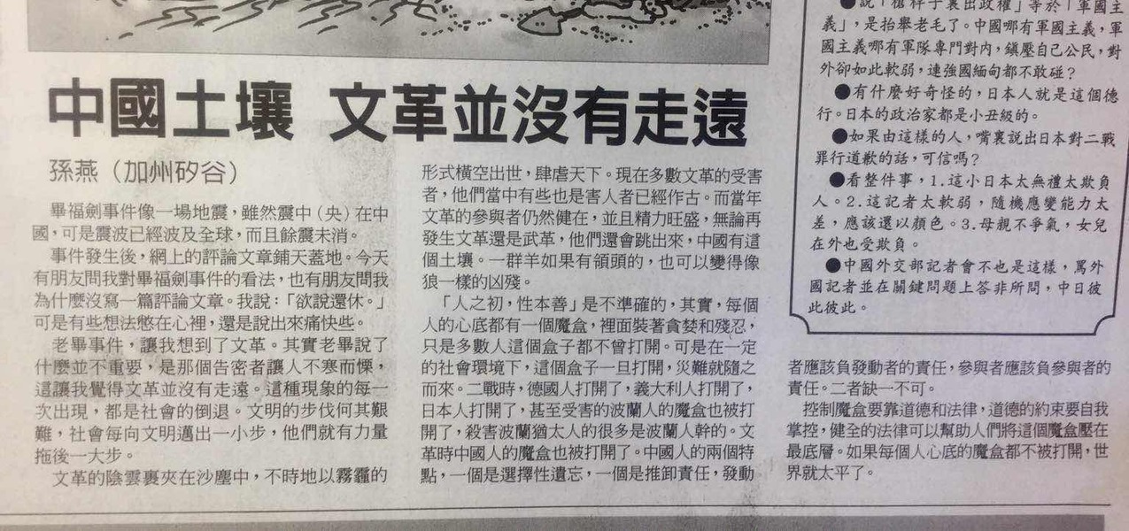 今天世界日报B8 世界论坛版刊登了我的文章“文革并没有走远”。在书店买报纸时与老板攀谈。他非常赞同我的观点,人都有恶的一面,比如贪婪。他坦率地跟我讲了他的经历,一天他在店里上班,看见一个人买了一张一元钱的刮刮乐,刮出了一百元,这让从不赌博从不上赌场的他也动了心,于是他和太太打开银箱拿了两元钱,当他们确认没有刮出任何金钱的时候,他们的第一反应是再次冲向银箱,这一刻,人性中的贪婪不可遏制地从心底的魔盒挤出来,太太的眼睛里放着光:再试一下。老板动情地描述了当时的心情,就是贪婪,想赌,想赢。幸运的是在理性和贪婪的决斗中,理性最终占了上风,伸向银箱的手及时地停了下来。谈起那段经历,老板至今心有余悸。