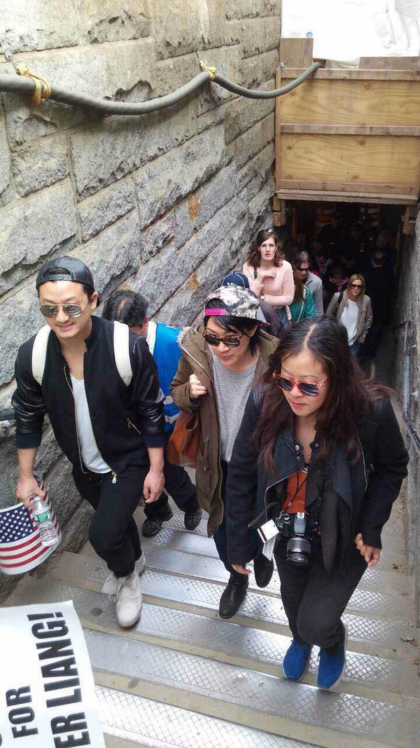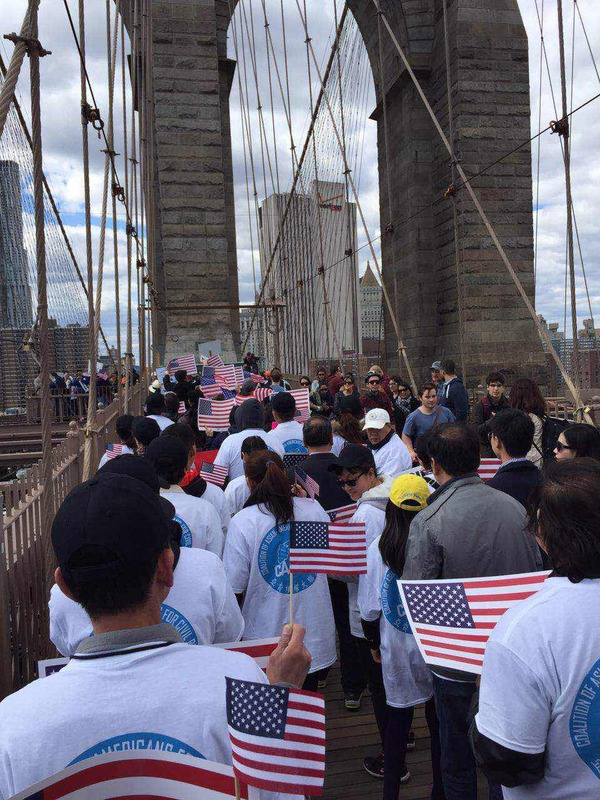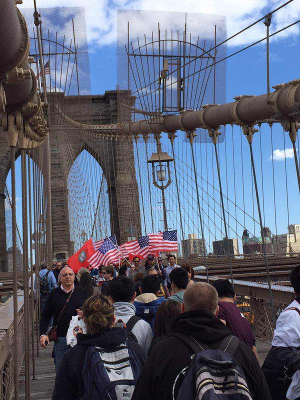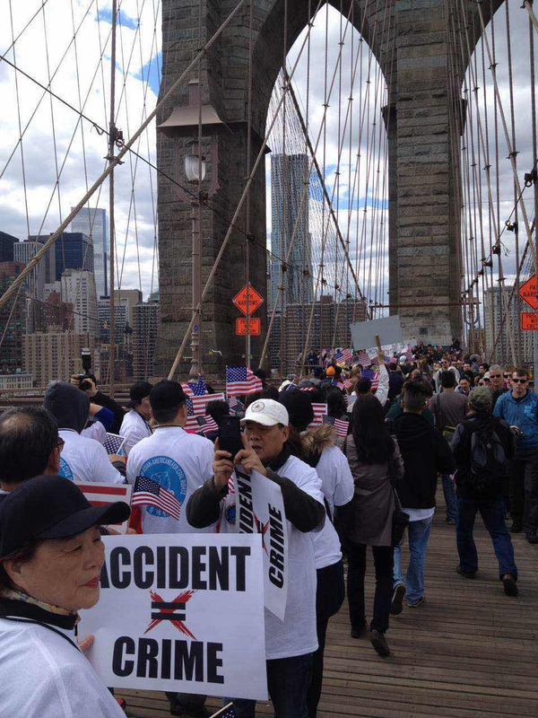 的自由女神的护航,你们的右手是高举的标语:为了自己和孩子们争权益。历史会记得你们的,因为你们站在了桥头,勇敢地追求我们的权益,你们让我感动,让我充满激情,更让我们自豪。终有一天我们的子孙也会骄傲地忆起他们的先祖为争取自己的自由、权益、和梦想:三月八日与四二六,市府官邸和Brooklyn 桥。是各位走出的最重要的一大步。也为华人争权历史留下了最重要的一页。