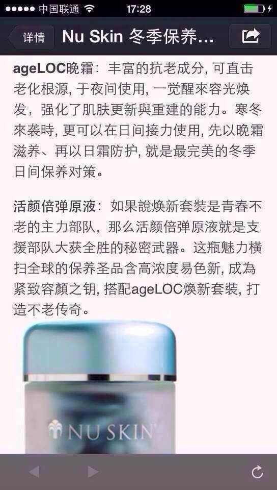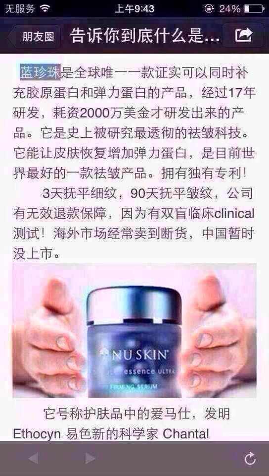 蓝珍珠简介一下:蓝珍珠是Nuskin17年成果独有专利. 它强效抗氧化,含无色类胡萝卜素维他命C及E,辅酶Q10及 Pharmanex绿茶精华是保持年轻的不二法门‼️ 能中和游离基对肌肤的破坏. 减少弹力蛋白的流失这才是真正的锁住青春保持年轻,直达皮肤最底层的皮下组织。你知道吗?在皮肤弥补网当中。胶原蛋白一旦流失就会肌肤下垂,产生皱纹。色斑暗沉全部浮现。女人多疼自己一点。来瓶蓝珍珠吧。