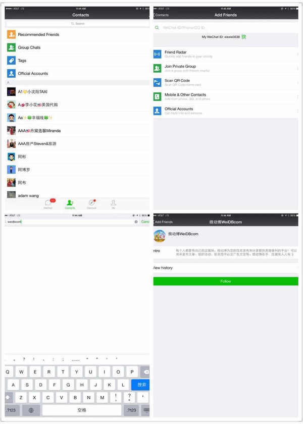 首先,通过加好友的方式加微信号WeiDBcom。可以直接通过如下图所示的方式加,或者扫描二维码,或者加xiexie5638请其分享微信名片,或者,在微信下的话,最简单了,就猛戮这里吧。