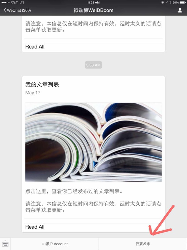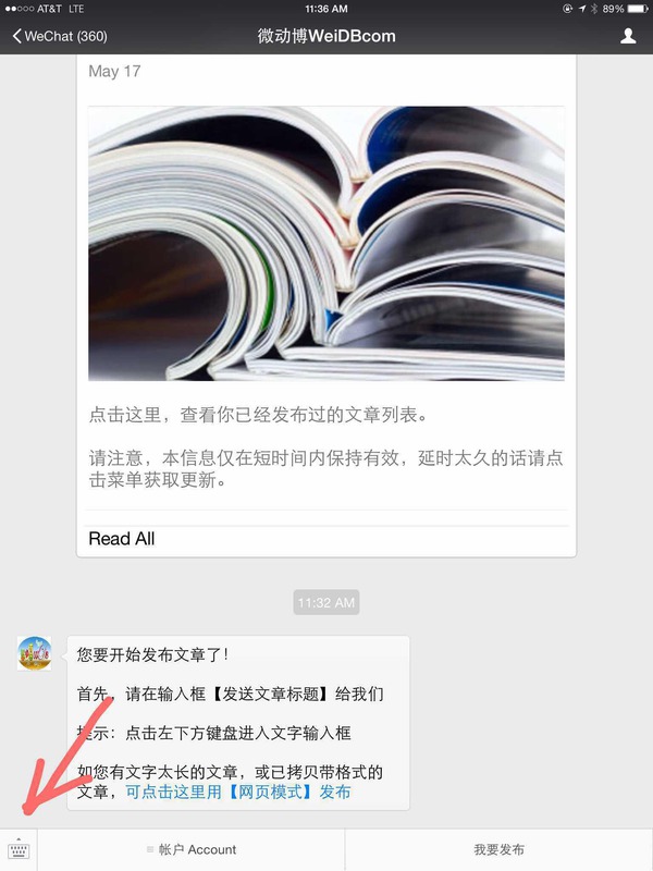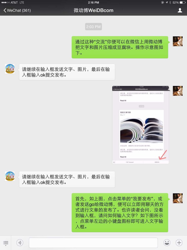 首先,如上图,点击菜单的“我要发布”,或发送go给微动博,便可立即用聊天的方式进行文章发布。也许读者会问,没看到输入框,如何输入文字?如下图所示,点菜单左边的小键盘图标即可进入文字输入框。