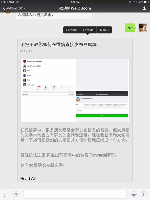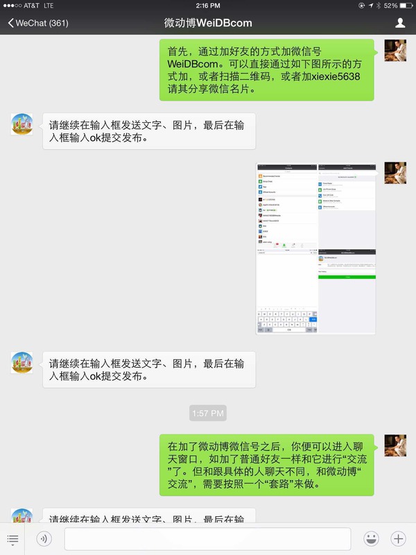 如下,我输入标题。然后微动博让我继续发送文字和图片,直到最后我觉得没有更多信息需要发布了,按照提示,我发ok给它。