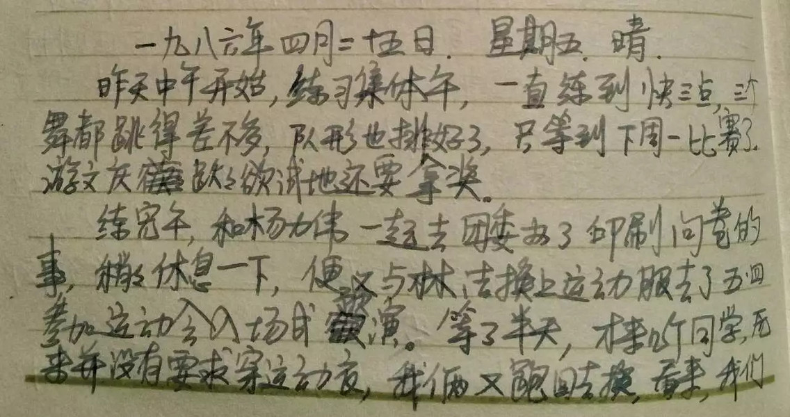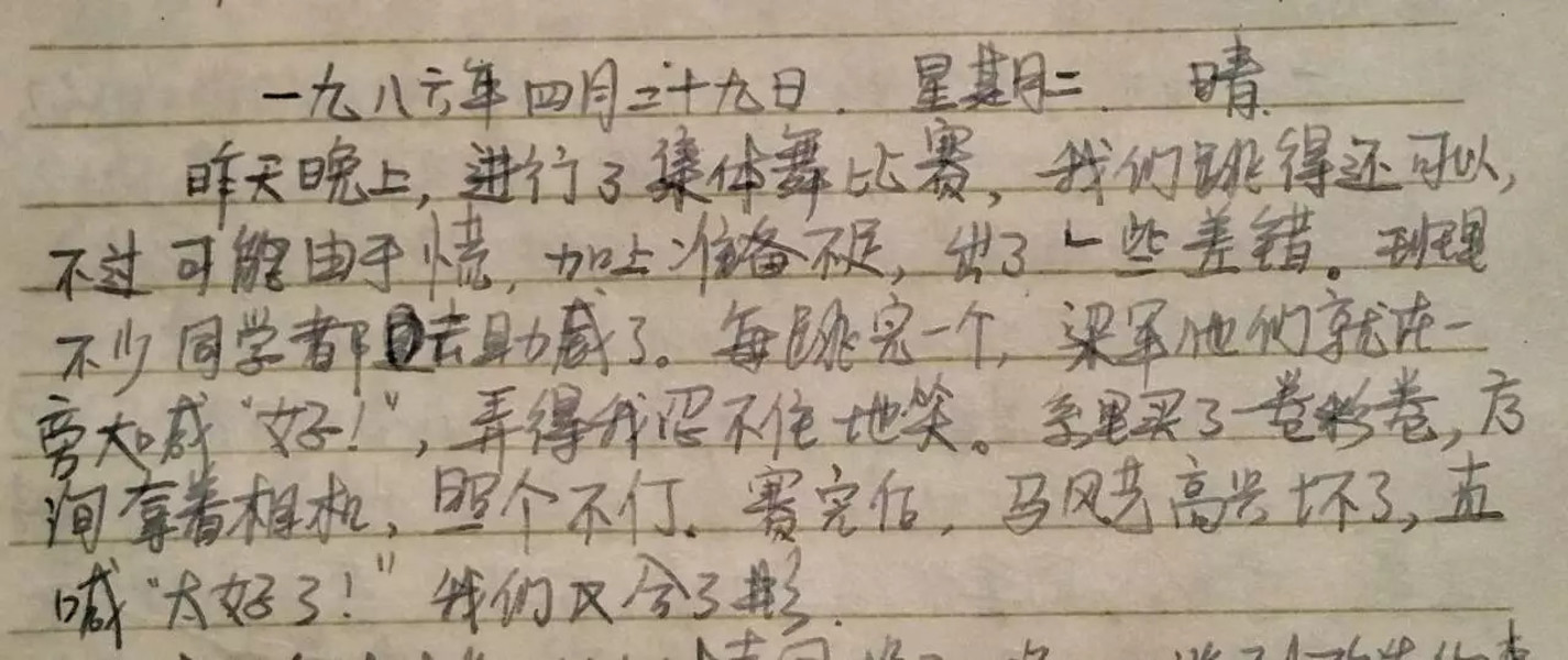 昨天晚上,进行了集体舞比赛。我们跳的还可以。不过可能由于慌,加上准备不足,出了一些差错。班里不少同学都去助威了。每跳一个,梁军他们就在一旁大喊“好”,弄得我忍不住地笑。系里买了一卷彩卷,廖洵拿个相机,照个不停。赛完后,马凤芝高兴坏了,直喊“太好了!” 我们又合了影。”