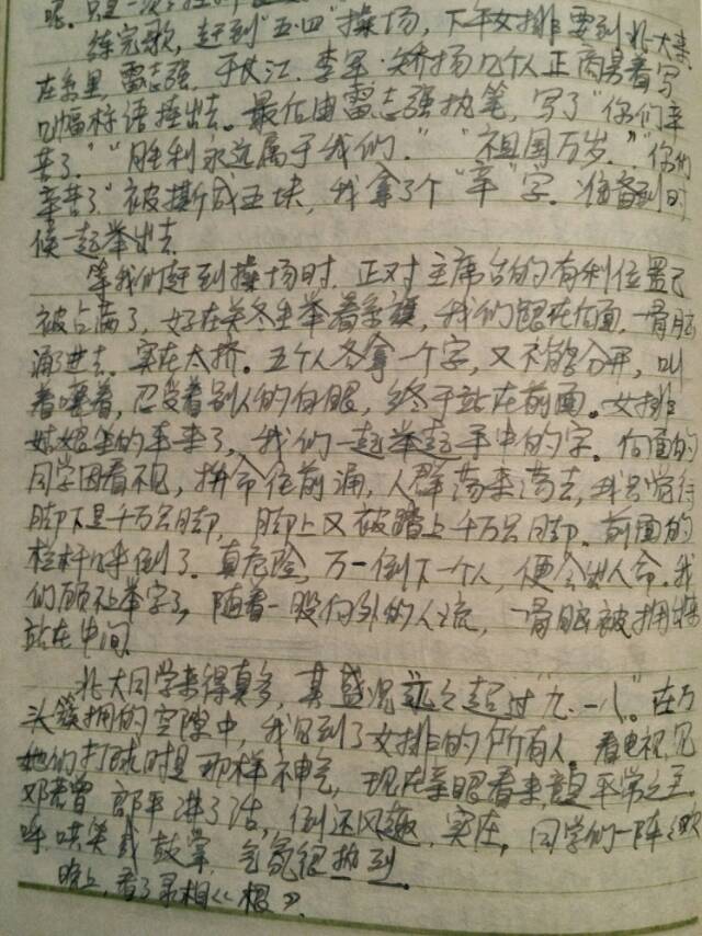 等我们赶到操场时,正对主席台的有利位置已被占满了。好在关冬生举着系旗,我们跟在后面,一股脑拥进去。实在太挤。五个人各拿一个字,又不能分开,叫着嚷着,忍受着别人的白眼,终于站到前面。女排姑娘坐的车来了。我们一起举起手中的字。后面的同学因看不见,拼命往前涌。人群荡来荡去,我只觉得脚下是千万只脚,脚上又被踏上千万只脚。前面的栏杆几乎倒了。真危险。万一倒下一个人,便会出人命。我们顾不上举字了,随着一股向外的人流,一股脑被拥出来,站在中间。